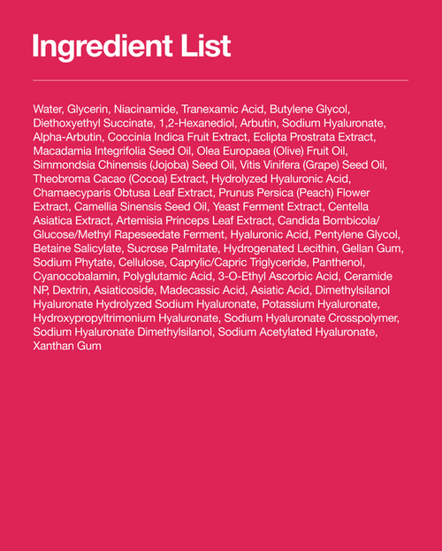 INGREDIENTS: Water, Glycerin, Niacinamide, Tranexamic Acid, Butylene Glycol, Diethoxyethyl Succinate, 1,2-Hexanediol, Arbutin, Sodium Hyaluronate, Alpha-Arbutin, Coccinia Indica Fruit Extract, Eclipta Prostrata Extract, Macadamia Integrifolia Seed Oil, Olea Europaea (Olive) Fruit Oil, Simmondsia Chinensis (Jojoba) Seed Oil, Vitis Vinifera (Grape) Seed Oil, Theobroma Cacao (Cocoa) Extract, Hydrolyzed Hyaluronic Acid, Chamaecyparis Obtusa Leaf Extract, Prunus Persica (Peach) Flower Extract, Camellia Sinensis Seed Oil, Yeast Ferment Extract, Centella Asiatica Extract, Artemisia Princeps Leaf Extract, Candida Bombicola/Glucose/Methyl Rapeseedate Ferment, Hyaluronic Acid, Pentylene Glycol, Betaine Salicylate, Sucrose Palmitate, Hydrogenated Lecithin, Gellan Gum, Sodium Phytate, Cellulose, Caprylic/Capric Triglyceride, Panthenol, Cyanocobalamin, Polyglutamic Acid, 3-0-Ethyl Ascorbic Acid, Ceramide NP, Dextrin, Asiaticoside, Madecassic Acid, Asiatic Acid, Dimethylsilanol Hyaluronate, Hydrolyzed Sodium Hyaluronate, Potassium Hyaluronate, Hydroxypropyltrimonium Hyaluronate, Sodium Hyaluronate Crosspolymer, Sodium Hyaluronate Dimethylsilanol, Sodium Acetylated Hyaluronate, Xanthan Gum